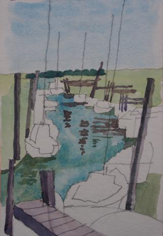 En juin 2023 j'ai fait un stage d'aquarelle à l'île de Ré dans la petite ville d'Ars en Ré. Nous étions 7 personnes plus le professeur qui avait organisé ce voyage. Nous logions dans la ville dans une magnifique et très grande maison avec une petite cour à l'arrière nous permettant de prendre nos repas à l'extérieur. Courses et repas faits par nous-mêmes, à tour de rôle . Il faisait une chaleur extrème l'après-midi ce qui fait que nous partions vers 16h pour aller peindre.