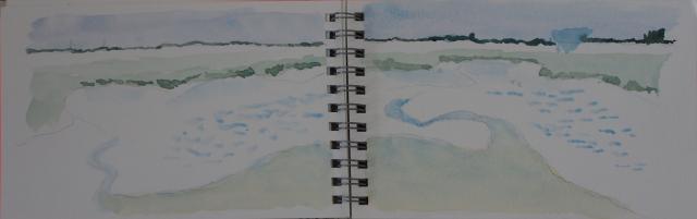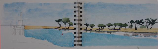 Nous avons peint dans la ville d'Ars en Ré qui est une jolie bourgade dont l'architecture est typique de cette région : maisons blanches avec volets bleus, verts ou blancs. Ville très fleurie. L'île de Ré est la reine pour les ballades à vélo. Nous en avons rencontré beaucoup au cours de nos excursions. Etant venus avec deux voitures nous avons rayonné autour d'ars en Ré pour trouver des motifs à peindre. Notre professeur connaissait déjà les environs et nous a emmené dans des endroits magnifiques. Je vous présente quelques sujets que j'ai peints sur mon carnet de voyage.